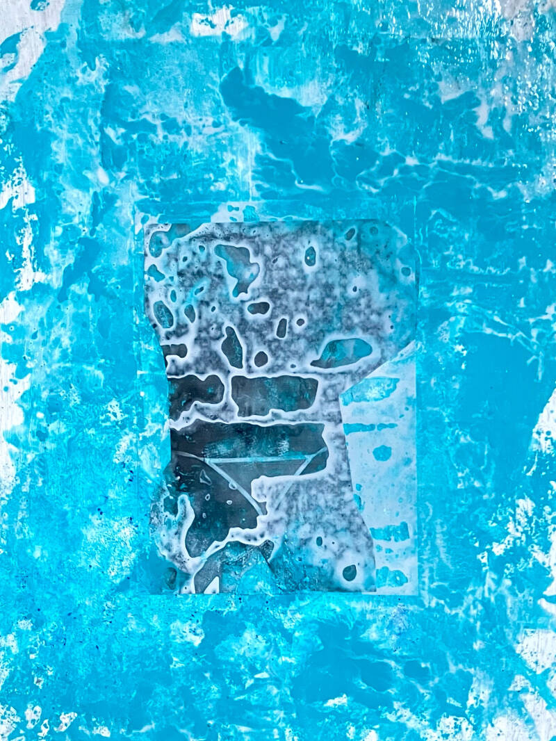 de différents médiums: l’eau pour la fluidité, la résine, des vernis,...